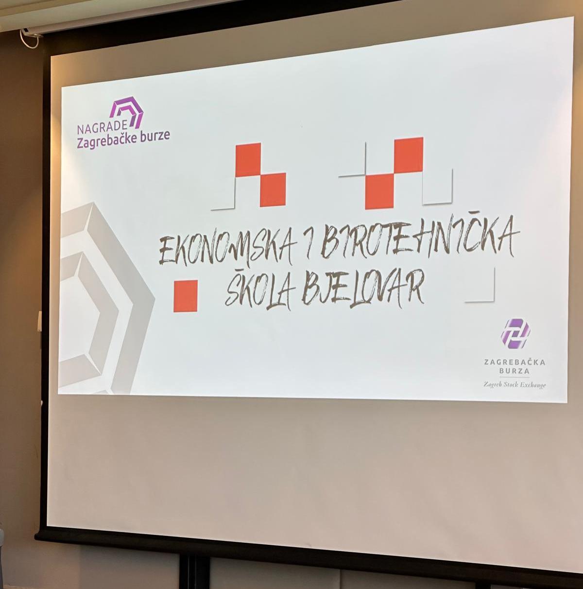 Ekonomska i birotehnička škola Bjelovar ove je godine ostvarila još jedan izniman uspjeh, osvojivši prestižnu Nagradu Akademije Zagrebačke burze za doprinos edukaciji o tržištu kapitala i financijskoj pismenosti za 2024. godinu. Priznanje, koje odaje počast dugogodišnjem kvalitetnom radu ove institucije, svečano je uručeno na dodjeli nagrada u zagrebačkom Hotelu Westin. Nagradu je dodijelila Ivana Gažić, predsjednica Uprave Zagrebačke burze, a u ime škole preuzeo ga je ravnatelj Vladimir Štefanec. Na događaju su prisustvovale i nastavnice ekonomske grupe predmeta Marija Dušek, Matea Kanjka i Nikolina Stanivuković Medak.