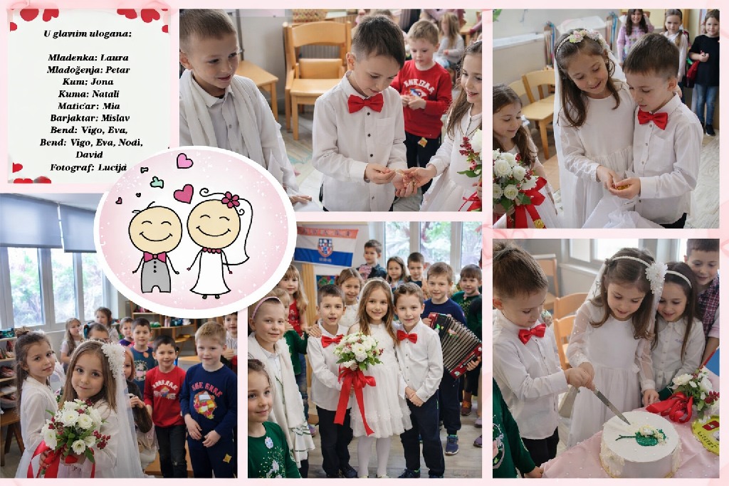 Uz puno smijeha, uzbuđenja i pažljivo podijeljenih uloga, djeca su organizirala pravu malu svečanost. Mladenka Laura i mladoženja Petar imali su svoje kumove, matičarku, barjaktara, bend i fotografa. Nije nedostajalo ni buketa, prstenja, svečanih odjevnih kombinacija, kao ni hrvatske zastave koja je dodatno upotpunila ugođaj.
