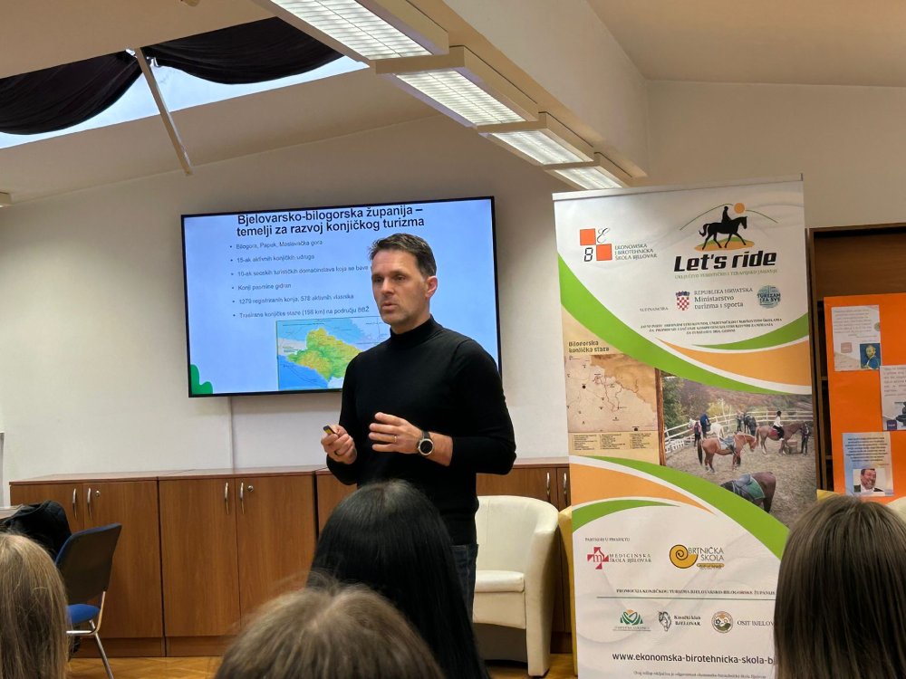Jučer je u knjižnici srednjoškolskog centra održan prvi radni sastanak na kojemu je učenicima i mentorima sudionika projekta direktor Turističke zajednice Bjelovarsko-bilogorske županije Marcel Medak održao predavanje o konjičkom turizmu u regiji, ističući terapijsko jahanje kao poseban segment turizma. Konjički turizam je važna grana turizma koja može privući turiste i doprinijeti lokalnom gospodarstvu. Na predavanju se govorilo o razvoju konjičkog turizma, mogućnostima koje nudi lokalnim zajednicama, i njegovoj ulozi u promoviranju regije kao atraktivne destinacije za ljubitelje prirode, sporta i zdravlja.