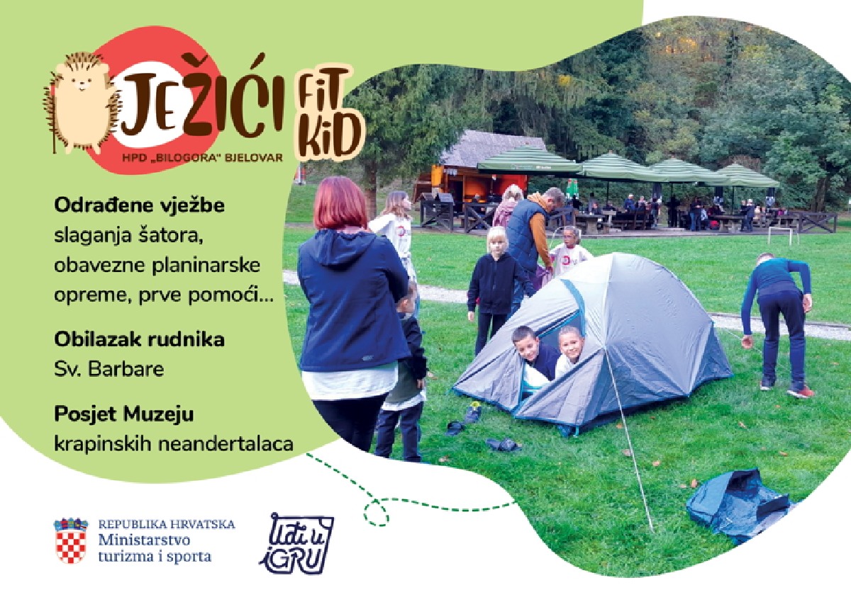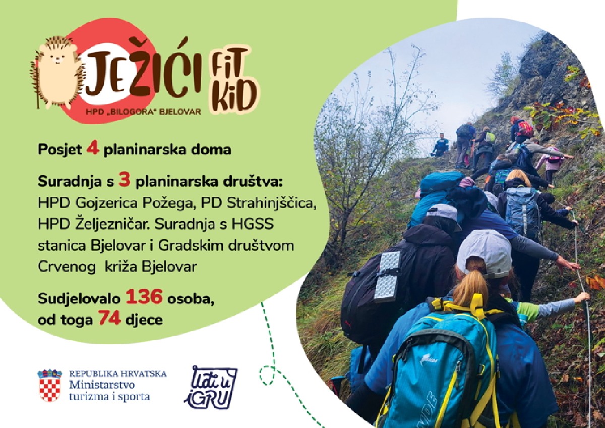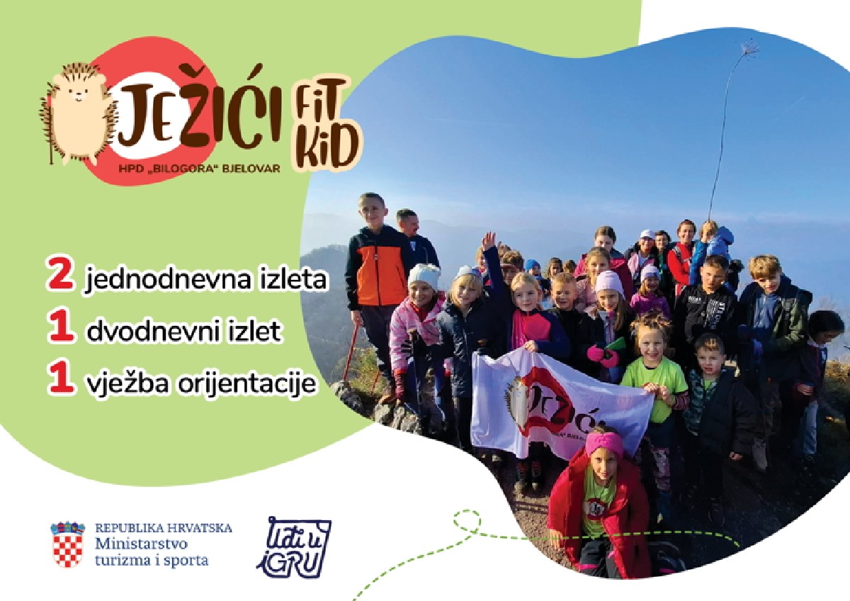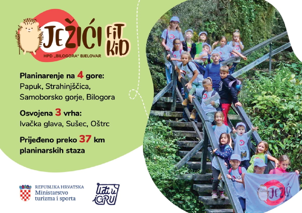 HPD Bilogora Bjelovar pokrenula je ove jeseni projekt za djecu pod nazivom „FIT KID JEŽIĆI“. Projekt je financiran sredstvima Ministarstva turizma i sporta, dobivenim putem natječaja za sufinanciranje sportskih programa usmjerenih na poticanje lokalnog sporta i sportskih natjecanja za 2024. godinu. Ukupna vrijednost projekta iznosi 5.903,60 eura, od čega je čak 85 % osigurano kroz sredstva Ministarstva turizma i sporta. Cilj projekta je bio promocija tjelesne aktivnosti i zdravih navika kod djece, što je u skladu s misijom HPD Bilogora da potiče aktivan i zdrav način života kroz planinarenje i sportske aktivnosti.