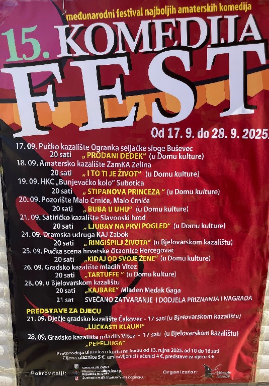 U Bjelovaru je u tijeku 15. Međunarodni festival najboljih amaterskih komedija – Komedija fest, koji i ove godine donosi pregršt smijeha i vrhunske izvedbe amaterskih kazališta iz Hrvatske, Srbije i Bosne i Hercegovine.