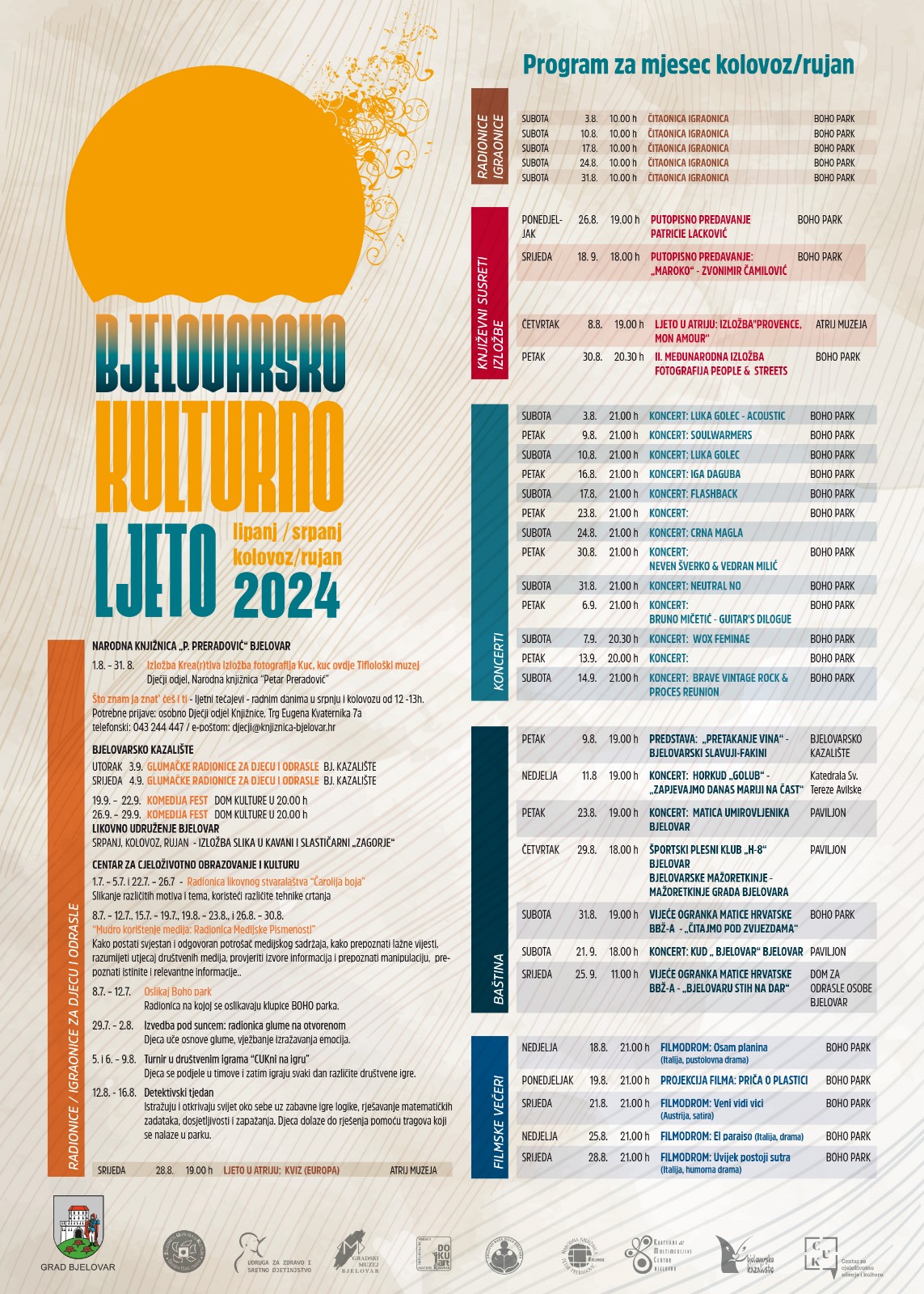 Tako djecu u kolovozu svake subote od 10 sati očekuje čitaonica i igraonice u Boho parku. Tu su i brojni književni susreti i izložbe u Boho parku i atriju muzeja. Tijekom kolovoza i rujna pripremljeno je čak 13 koncerata, a prvi slijedi već ove subote od 21 sat u Boho parku. Nastupit će Luka Golec – Acoustic. Tu su i raznovrsni koncerti posvećeni baštini gdje će se predstaviti Bjelovarski slavuji-fakini, HORKUD „Golub“, Matica umirovljenika Bjelovar, Športsko-plesni klub H-8, Vijeće ogranka Matice Hrvatske BBŽ-a.