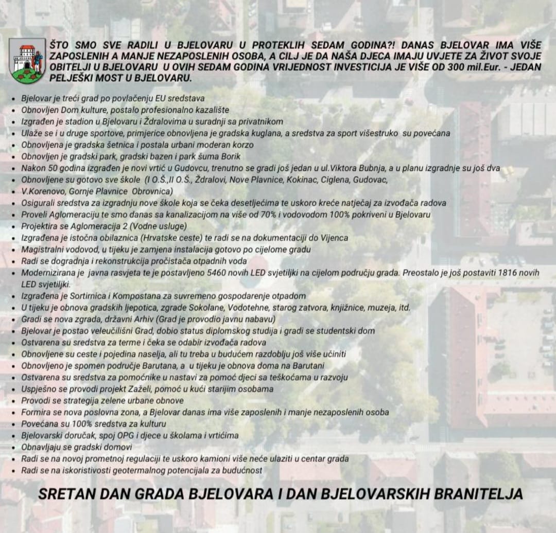– Dan Grada Bjelovara dobra je prilika da pogledamo unazad, ali i naprijed te vidimo što sve imamo iza sebe te što je to ispred nas. Kada je film nastajao puno smo toga dodatno ubacivali i sigurno nismo sve nabrojali. Već jučer smo započeli s projektiranjem buduće malokalibarske streljane, jedine u Hrvatskoj. Kada razmislite o 300 milijuna eura vrijednih projekata dođe mi da se uštipnem. Jedan grad od manje 40 tisuća stanovnika će realizirati u naredne dvije, maksimalno tri godine projekata koji su u vrijednosti 300 milijuna eura, a to je 2/3 vrijednosti Pelješkog mosta. Da nije bilo europskih fondova te jedne dobre sinergije i suradnje s Vladom RH vjerujem da ne bi bilo niti 300 milijuna eura u Bjelovaru. To je velik novac koji će preporoditi Bjelovar u infrastrukturnom, ali i financijskom smislu – naglasio je gradonačelnik Hrebak.