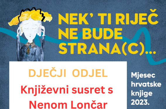 Mjesec hrvatske knjige u Narodnoj knjižnici “Petar Preradović” otvorit će se književnim susretom s književnicom Nenom Lončar. Susret je zakazan za ponedjeljak, 16. listopada 2023. s početkom u 12 sati na Studijskom odjelu knjižnice.
