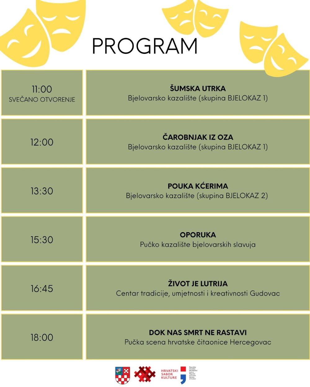 – Posebno ističemo kako je ulaz slobodan na sve predstave jer želimo omogućiti što širem krugu građana da uživaju u kazališnoj umjetnosti i podrže rad naših vrijednih amaterskih skupina. Pozivamo sve ljubitelje kazališta da nam se pridruže i provedu dan uz emociju, smijeh i priče koje donose ponajbolje amaterske kazališne predstave naše županije – poručio je Boris Abramović, predsjednik Zajednice kulturno-umjetničkih udruga Bjelovarsko-bilogorske županije.