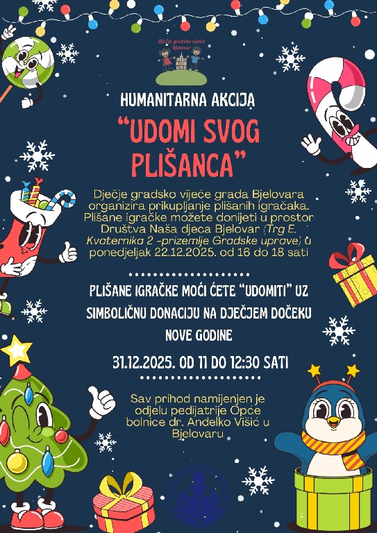 Dječje gradsko vijeće grada Bjelovara organizira humanitarnu akciju „Udomi svog plišanca“, s ciljem prikupljanja plišanih igračaka i sredstava za Odjel pedijatrije Opće bolnice dr. Anđelko Višić u Bjelovaru.