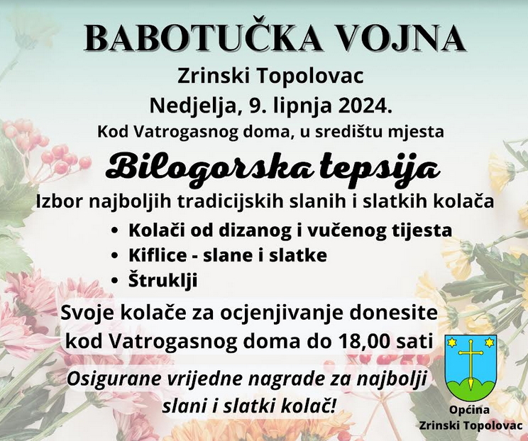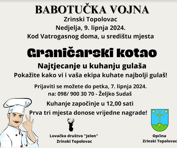 Također će se održati i dva kulinarska natjecanja – Graničarski kotao i Bilogorska tepsija. Za natjecanje u kuhanju gulaša možete se prijaviti do petka, 7. lipnja, na broj mobitela: 098/900-30-70 (Željko Sudaš), a kuhanje započinje u 12 sati. Tu je i izbor najboljih tradicijskih slanih i slatkih kolača. Svoje kolače za ocjenjivanje treba donijeti kod vatrogasnog doma do 18 sati. Općina Zrinski Topolovac osigurala je vrijedne nagrade za prva tri mjesta u svakoj kategoriji.