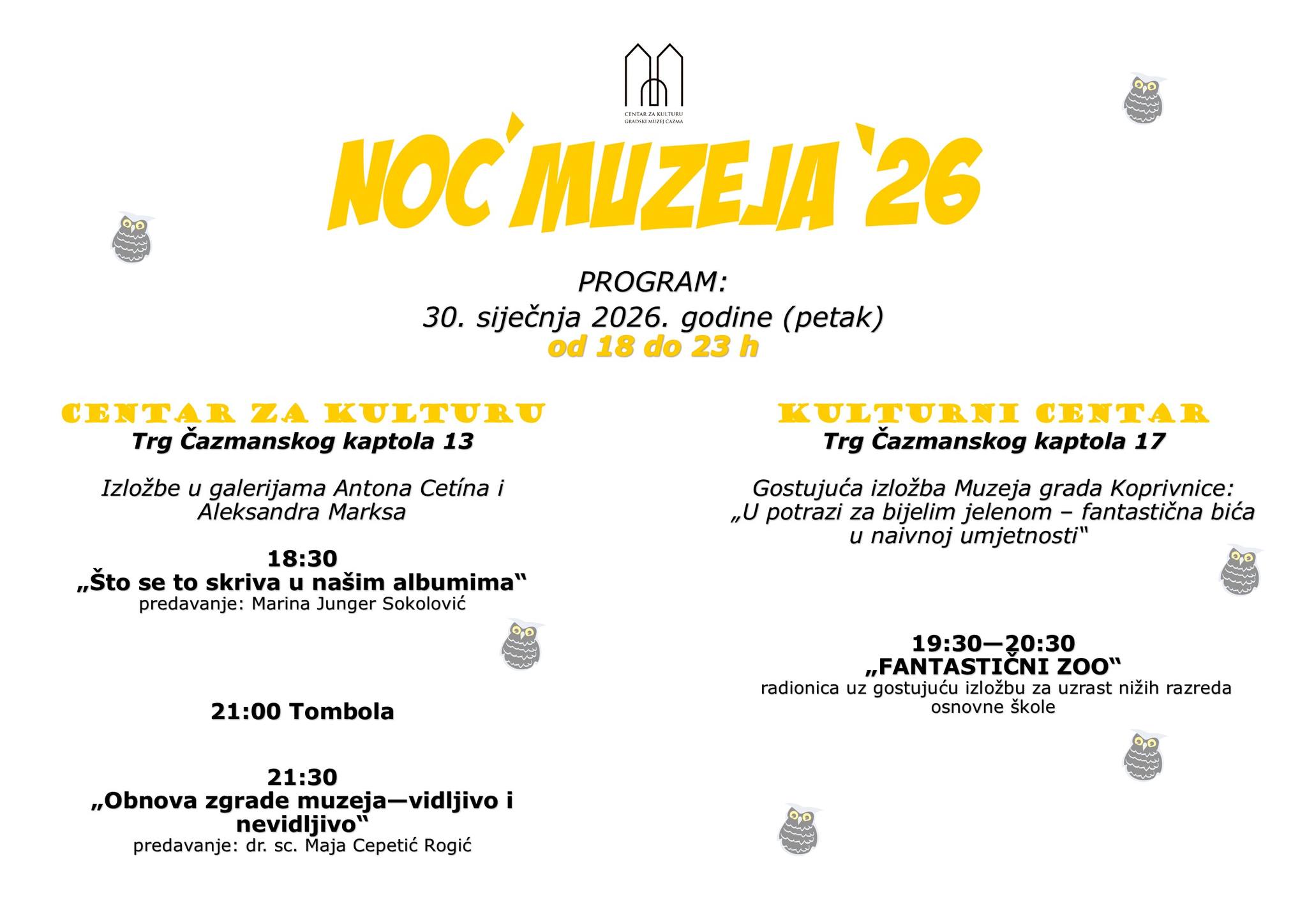 Gradski muzej Čazma i ove se godine priključuje obilježavanju 21. Noći muzeja, koja će se održati u petak, 30. siječnja 2026. godine, u vremenu od 18 do 23 sata. Program će se odvijati u dva izložbena prostora – Centru za kulturu i Kulturnom centru Čazma, a posjetitelje očekuje raznovrstan i sadržajan kulturni program.