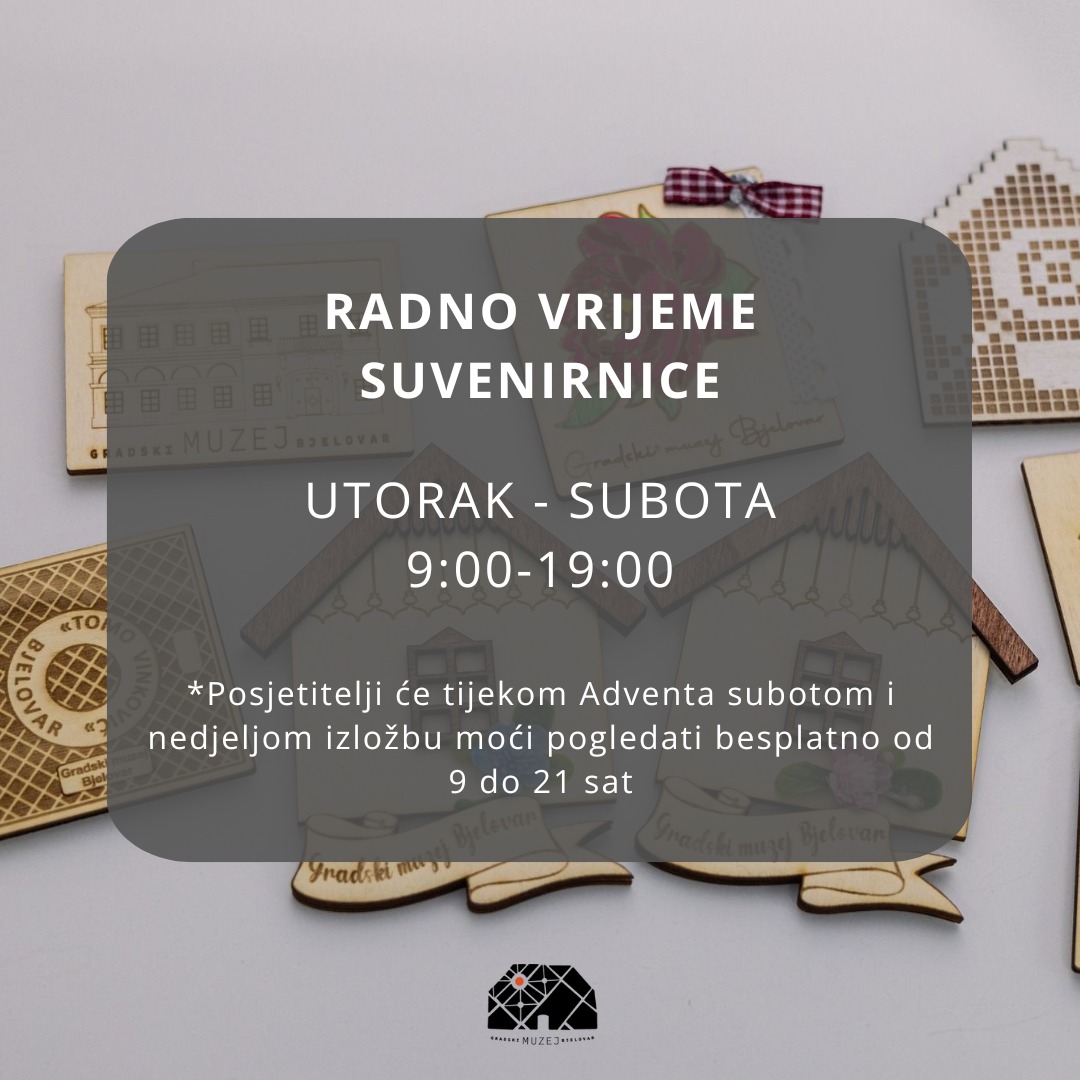 Gradski muzej Bjelovar otvorio je svoja vrata u blagdanskom duhu te najavio niz pogodnosti za sve posjetitelje. Suvenirnica Muzeja od sada radi prema proširenom radnom vremenu – od utorka do subote, od 9 do 19 sati, dok je ponedjeljak i dalje neradni dan.