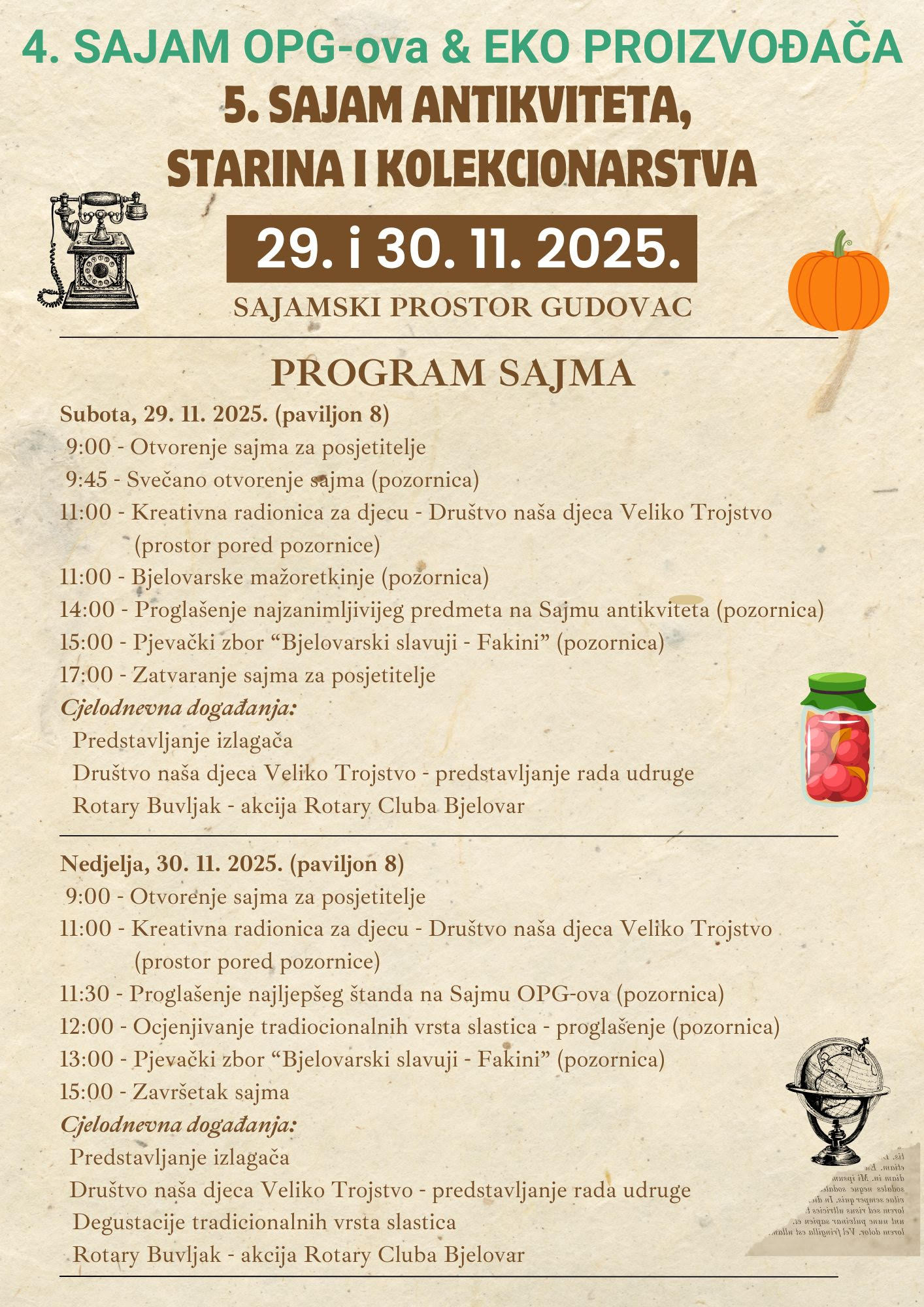 Sajamski prostor Gudovac ponovno će oživjeti bogatom ponudom antikviteta, rukotvorina, domaćih proizvoda i prigodnih sadržaja za sve generacije. U subotu i nedjelju, 29. i 30. studenoga 2025., održat će se dva velika događanja – 5. Sajam antikviteta, starina i kolekcionarstva te 4. Sajam OPG-ova & eko proizvođača.