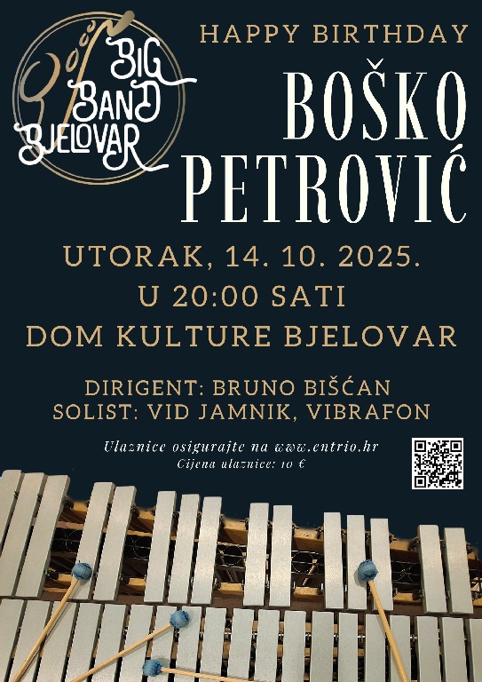 Bjelovarski Dom kulture uskoro će odjekivati jazzom! Big Band Bjelovar i Bruno Bišćan 14. listopada s početkom u 20 sati pripremaju koncert „Happy Birthday Boško Petrović“, u čast 90. obljetnice rođenja legende hrvatske i svjetske jazz scene.