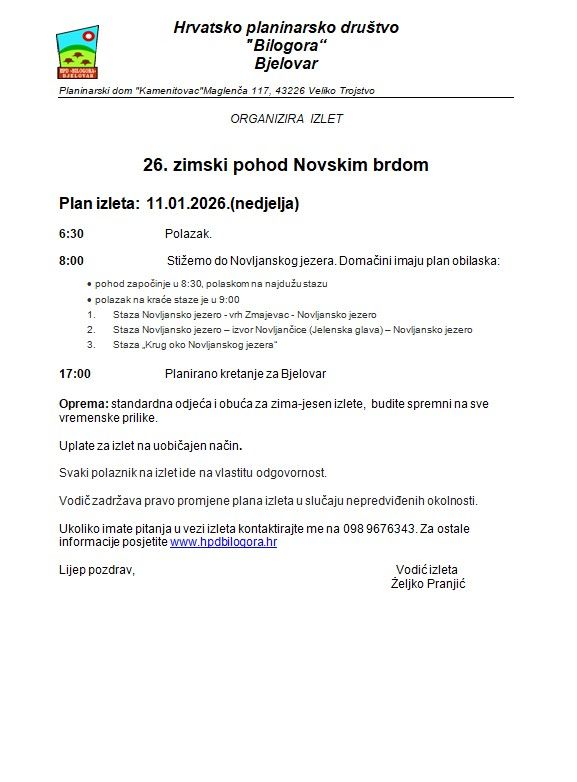 Hrvatsko planinarsko društvo „Bilogora“ iz Bjelovara poziva sve ljubitelje prirode i planinarenja na 26. zimski pohod Novskim brdom, koji će se održati u nedjelju, 11. siječnja 2026. godine.