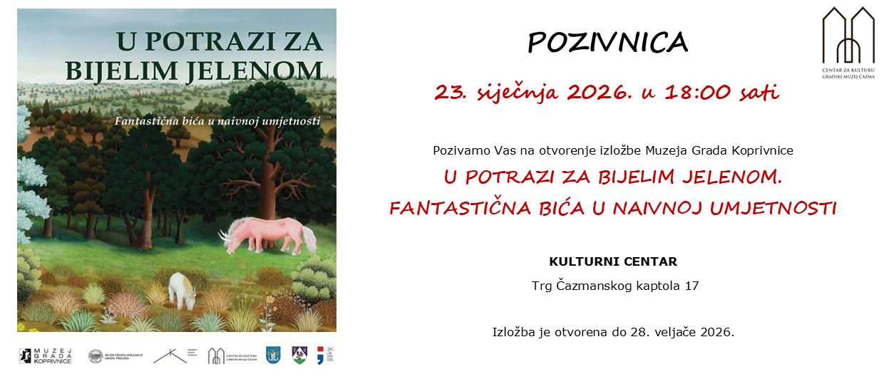 Kulturni centar Čazma u petak, 23. siječnja 2026. godine, s početkom u 18 sati, bit će domaćin otvorenja izložbe Muzeja Grada Koprivnice pod nazivom „U potrazi za bijelim jelenom – fantastična bića u naivnoj umjetnosti“.