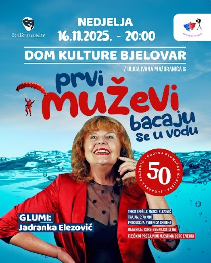 BJELOVAR – U nedjelju, 16. studenoga 2025. godine, s početkom u 20 sati, bjelovarski Dom kulture bit će domaćin posebnog kazališnog događaja – svečane izvedbe monodrame „Prvi muževi bacaju se u vodu“, kojom će Jadranka Elezović, jedna od najomiljenijih i najcjenjenijih hrvatskih glumica, obilježiti 50 godina impresivne glumačke karijere.