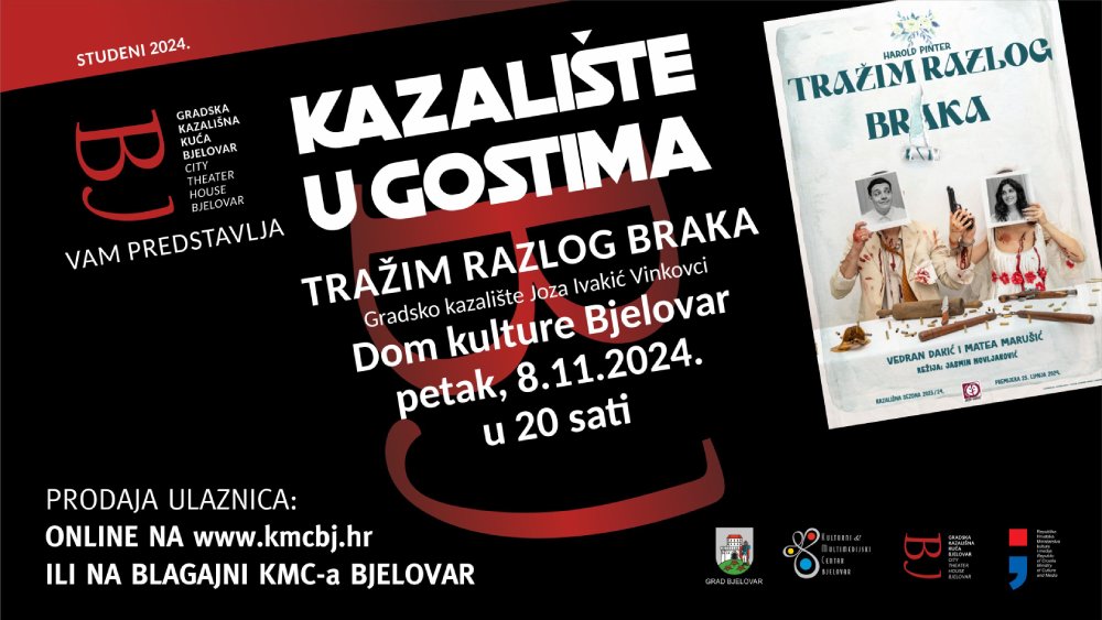 Kulturno-multimedijski centar Bjelovar i Gradska kazališna kuća Bjelovar pozivaju na program Kazalište u gostima. Ovoga puta u Bjelovar stiže predstava „Tražim razlog braka“ – komedija Gradskog kazališta „Joza Ivakić“ Vinkovci. Predstava će se održati u petak, 8. studenog, od 20 sati u bjelovarskom Domu kulture. Ulaznice možete kupiti ONLINE ili na blagajni KMC-a Bjelovar.