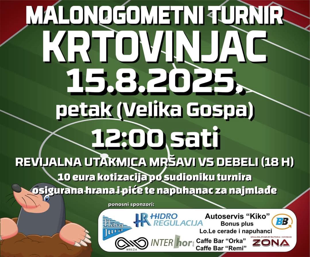 Na blagdan Velike Gospe, petak 15. kolovoza 2025., svi putevi vode na nogometno igralište u Velikom Trojstvu, gdje se održava tradicionalni Malonogometni turnir Krtovinjac, s početkom u 12:00 sati!