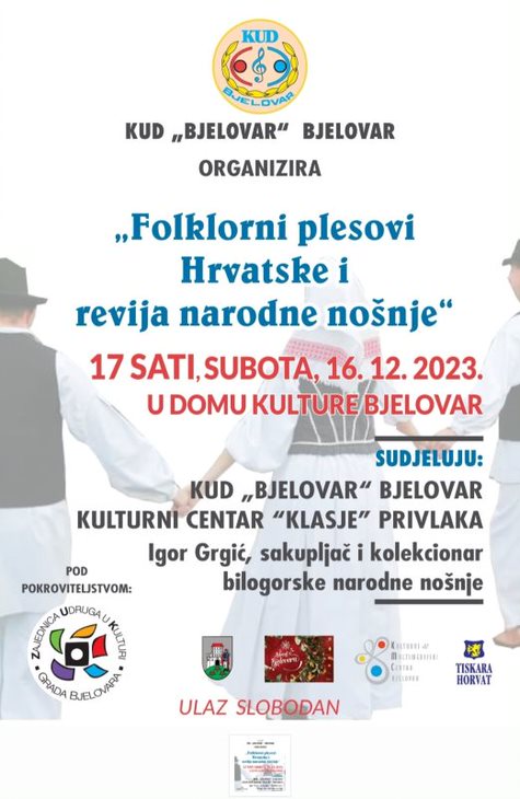 U subotu 16. prosinca s početkom u 17 sati ne propustite priliku sudjelovati u manifestaciji „Folklorni plesovi Hrvatske i revija narodne nošnje“ u organizaciji KUD-a „Bjelovar“ pod pokroviteljstvom Zajednice udruga u kulturi Grada Bjelovara. Program će se održati u Domu kulture u Bjelovaru, a nastupaju KUD „Bjelovar“ iz Bjelovara, kulturni centar „Klasje“ iz Privlake te Igor Grgić kao sakupljač i kolekcionar bilogorske narodne nošnje.