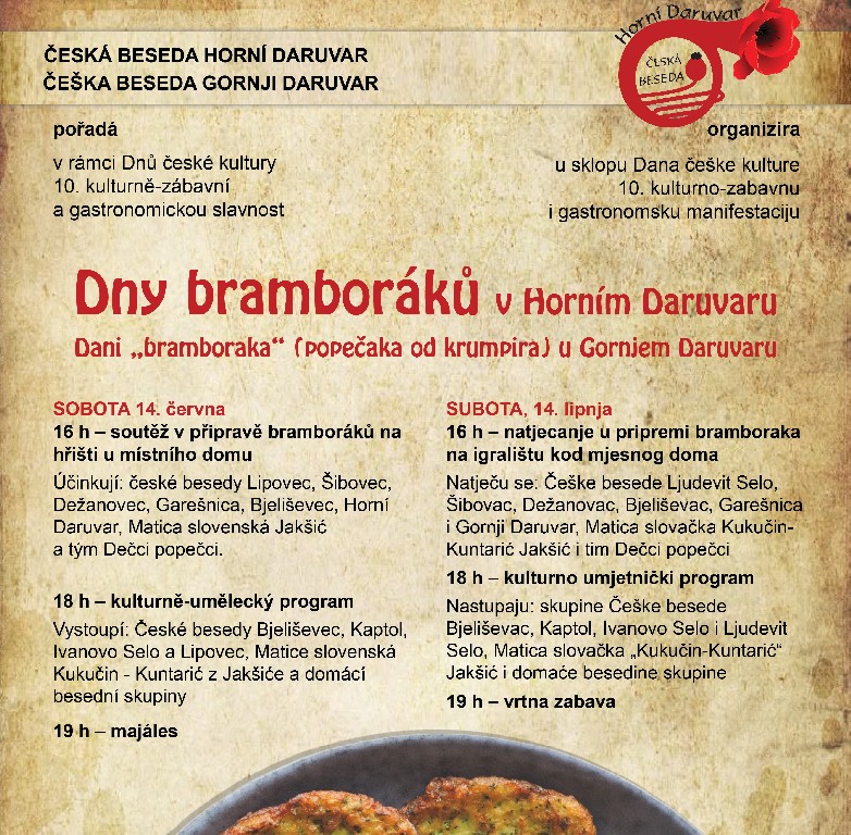 Gornji Daruvar će 14. lipnja 2025. ponovno zamirisati na tradiciju, glazbu i – bramborake! Udruga Češka beseda Gornji Daruvar desetu godinu zaredom organizira jednu od najoriginalnijih gastro-kulturnih manifestacija u regiji: Dan bramboraka, posvećen popečcima od krumpira – jelu koje je više od okusa, ono je simbol češke prisutnosti, zajedništva i običaja na daruvarskom području.