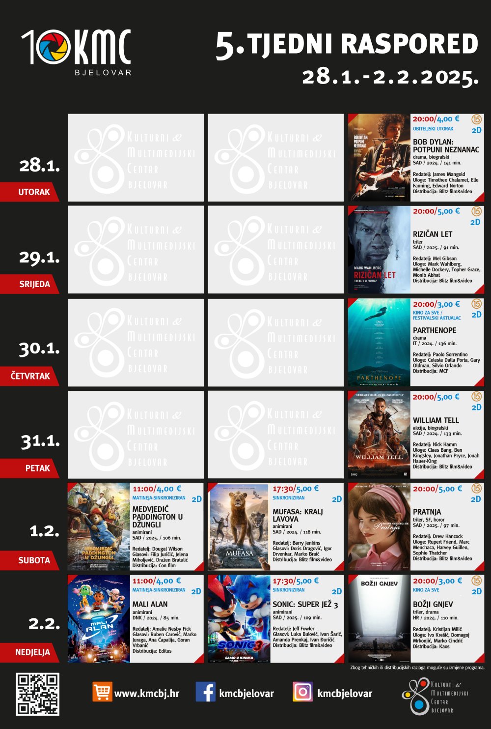 Osim kazališne izvedbe, KMC Bjelovar pripremio je i bogat filmski program. Raspored filmskih projekcija za tjedan od 28. siječnja do 02. veljače možete pronaći na plakatu niže ili online platformi KMC-a.