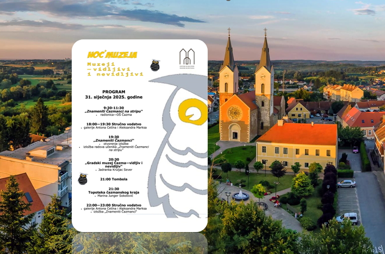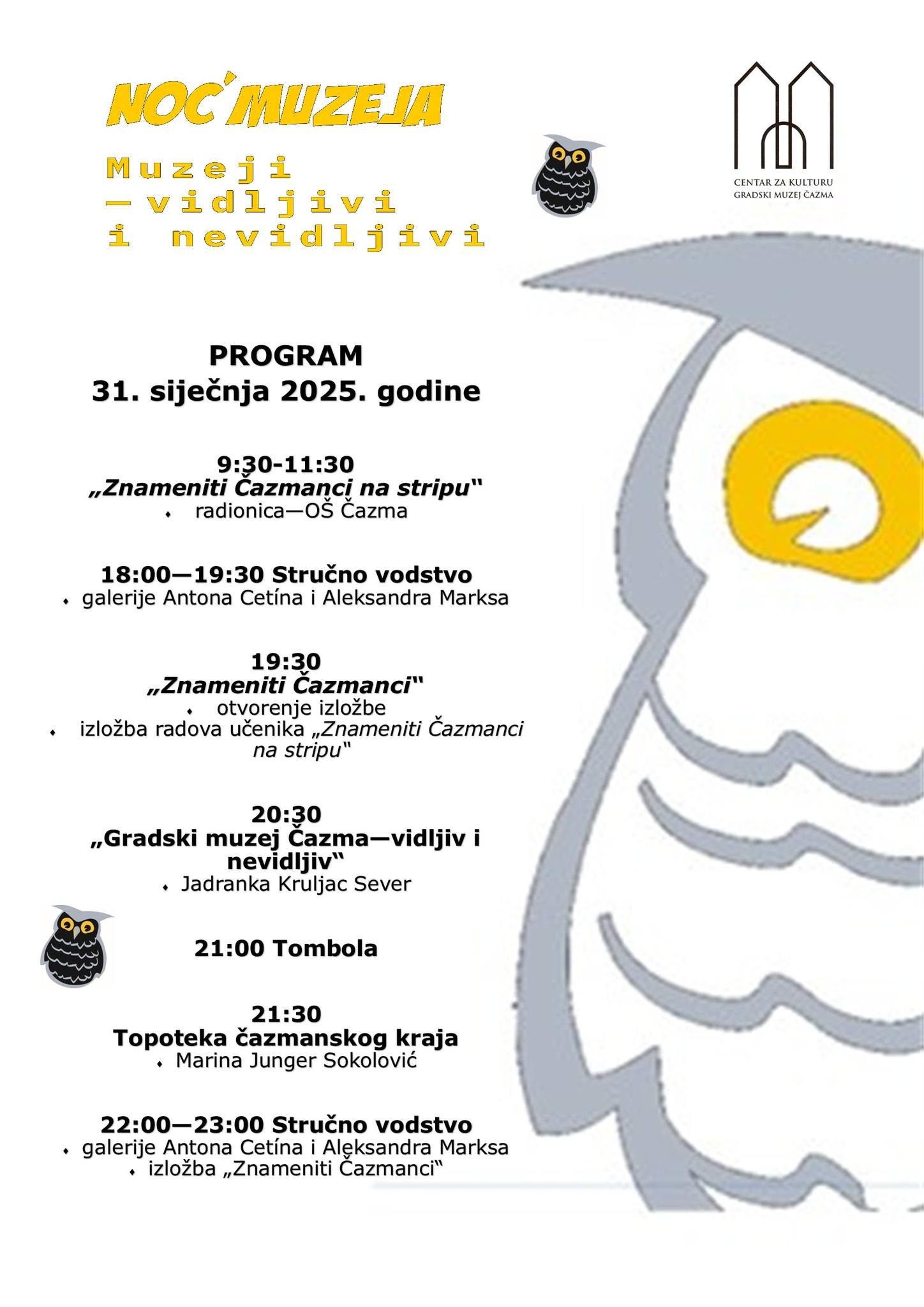 Gradski muzej Čazma i ove se godine pridružuje nacionalnoj manifestaciji Noć muzeja koja će se održati u petak, 31. siječnja 2025. godine. Tema ovogodišnje Noći muzeja je „Muzeji – vidljivi i nevidljivi“, s ciljem ukazivanja na važnu ulogu muzeja u prikupljanju, istraživanju, čuvanju i prezentiranju kulturne baštine svim generacijama.