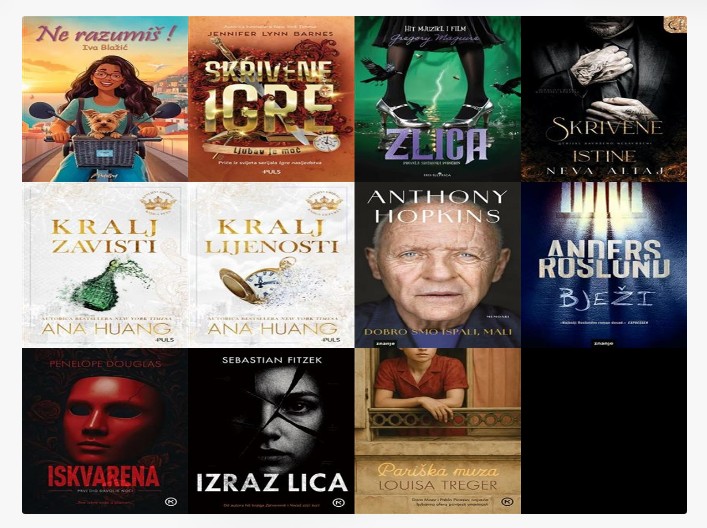 Među novitetima su i memoari poznatog glumca Anthony Hopkins „Dobro smo ispali, mali“, zatim napeti romani poput „Bježi“ švedskog autora Anders Roslund te psihološki triler „Izraz lica“ autora Sebastian Fitzek. Ljubitelji romantike i popularne književnosti mogu posegnuti za naslovima „Kralj zavisti“ i „Kralj lijenosti“ autorice Ana Huang, dok su za mlađe čitatelje i ljubitelje napetih priča dostupni i romani poput „Skrivena igra“ autorice Jennifer Lynn Barnes.