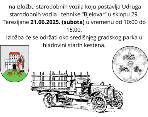 Ova omiljena carska manifestacija, koja nosi ime po carici Mariji Tereziji, donosi niz atraktivnih događanja tijekom cijelog vikenda, a među njima je i izložba starodobnih vozila i tehnike u organizaciji bjelovarske udruge ljubitelja oldtimera. Izložba se otvara u subotu, 21. lipnja, u 10 sati, oko središnjeg gradskog parka, a trajat će do 15 sati. Riječ je o jedinstvenoj prigodi da svi posjetitelji, posebno oni nostalgični i zaljubljeni u tehničku baštinu, izbliza pogledaju vozila i strojeve koji su obilježili prošla vremena.