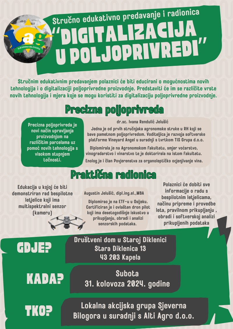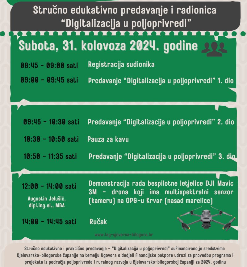 Stručnim edukativnim predavanjem polaznici će biti educirani o mogućnostima novih tehnologija i o digitalizaciji poljoprivredne proizvodnje. Predstavit će im se različite vrste novih tehnologija i mjera koje se mogu koristiti za digitalizaciju poljoprivredne proizvodnje. Stručno-edukativno i praktično predavanje „Digitalizacija u poljoprivredi“ sufinancirano je sredstvima Bjelovarsko-bilogorske županije na temelju Ugovora o dodjelu financijske potpore udruzi za provedbu programa i projekata iz područja poljoprivrede i ruralnog razvoja u Bjelovarsko-bilogorskoj županiji za 2024. godinu. Detalji i satnica se nalaze na plakatima niže.