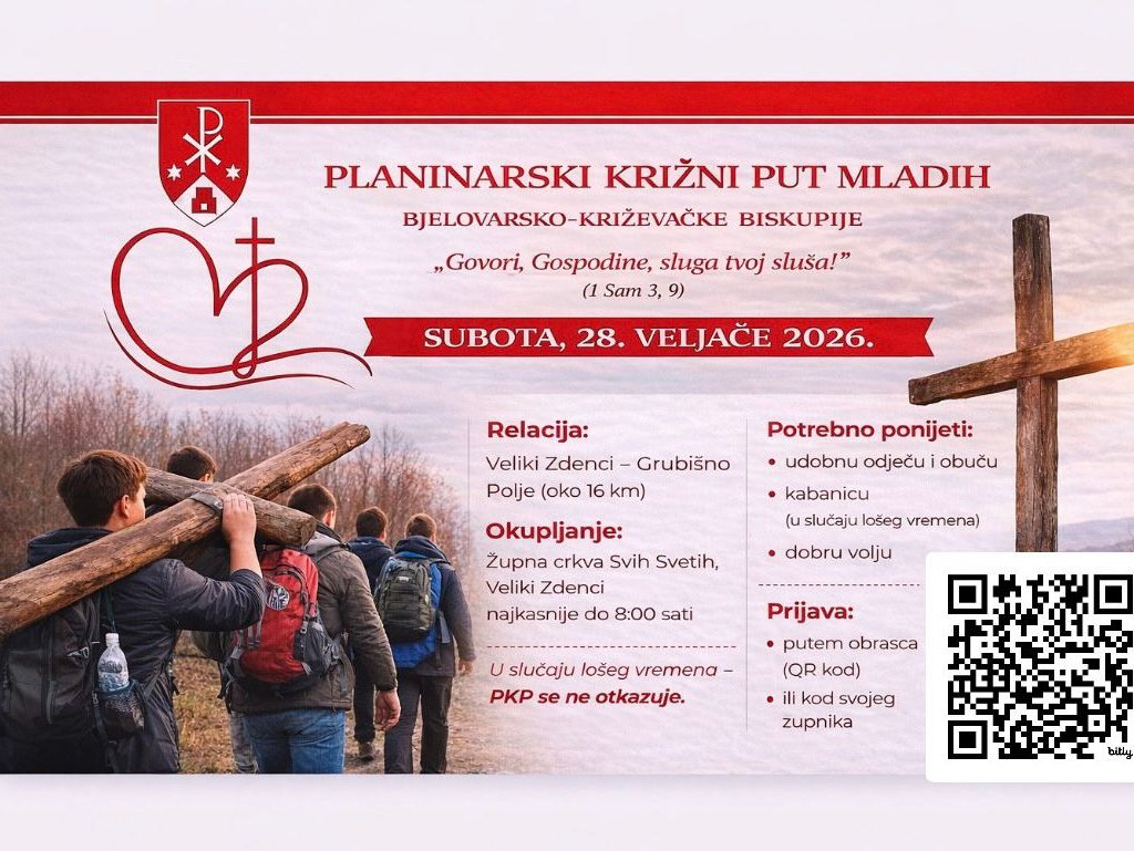 Pastoral mladih Bjelovarsko-križevačke biskupije organizira Planinarski križni put mladih koji će se održati u subotu, 28. veljače, na relaciji Veliki Zdenci – Grubišno Polje, pod geslom: „Govori, Gospodine, sluga tvoj sluša!“ (1 Sam 3, 9).