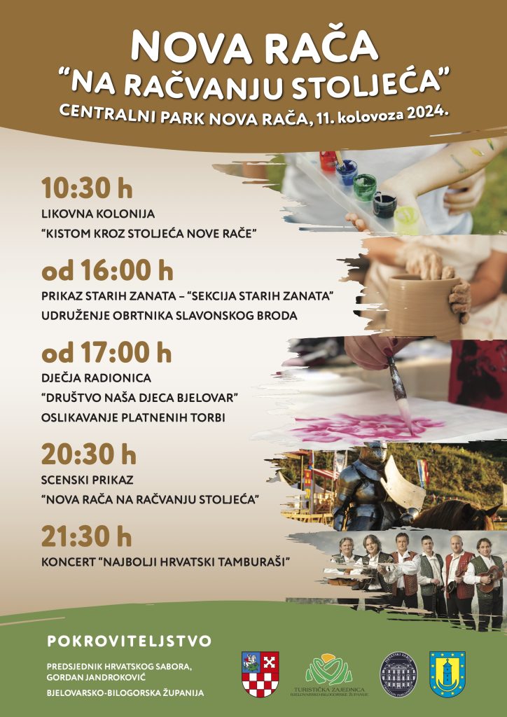 Navečer od 20:30 sati slijedi scenski prikaz „Nova Rača na račvanju stoljeća“ koji prikazuje bogatu višestoljetnu povijest Nove Rače, odnosno što je sve Općina Nova Rača prošla od srednjeg vijeka do modernih dana. U prikazu će sudjelovati brojni članovi kulturno-umjetničkih društva Bjelovarsko-bilogorske županije i okolice.