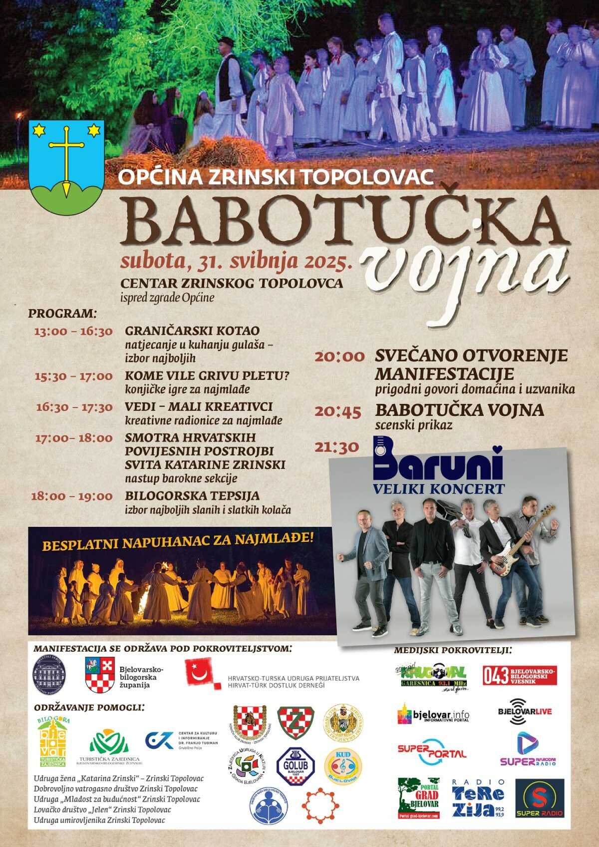 Bilogora je sama po sebi prepuna priča i legendi. Samo jedna od njih je „Babotučka vojna“, legenda koja se na širem području Zrinskog Topolovca prepričava gotovo pola tisućljeća. Hrabre su žene lukavo nadmudrile cijelu osmanlijsku vojsku i samog Ulama bega, a u pomoć su im pristigla i mitološka bića. Ova priča čuva sjećanje na hrabrost i obranu doma te domovine. Prikaz ove unikatne legende može se vidjeti u subotu, 31. svibnja, u središtu Zrinskog Topolovca.