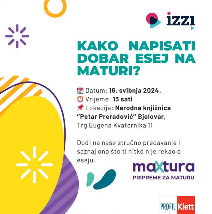 Za deset dana, točnije 24. svibnja, završava nastava za sve maturante. Tako su pripreme za državnu maturu u punom jeku, a maturanti će ispitima pristupiti u lipnju. Kao još jedan zanimljiv i vrijedan vid priprema za maturu Narodna knjižnica „Petar Preradović“ Bjelovar je organizirala predavanje „Kako napisati dobar esej na maturi?“. Ako si maturant i zanima te odgovor na ovo pitanje onda posjeti studijski odjel knjižnice u četvrtak, 16. svibnja, od 13 sati te saznaj više od predavačice Ivane Črnelč, prof. Prijava na predavanje je obavezna, a vrši se putem poveznice.
