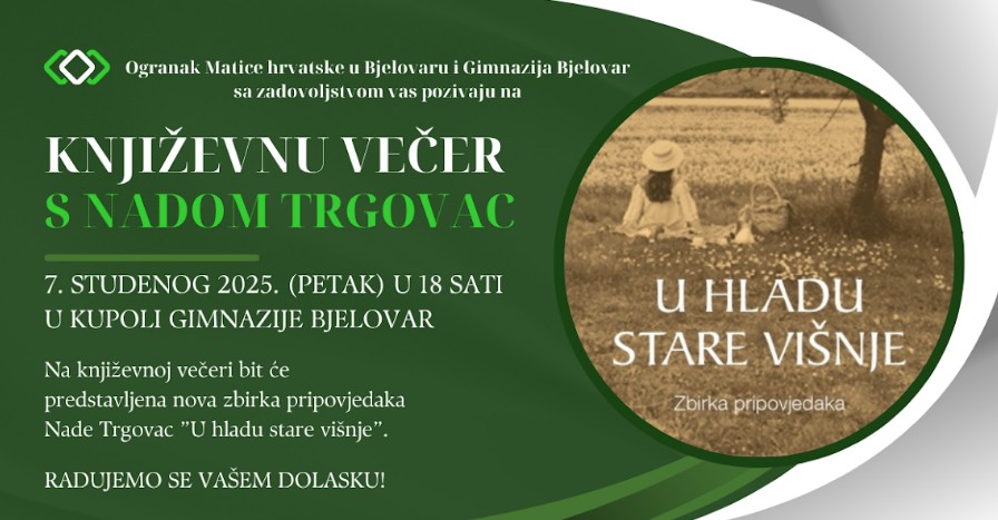 Ogranak Matice hrvatske u Bjelovaru i Gimnazija Bjelovar organiziraju promociju zbirke pripovjedaka Nade Trgovac „U hladu stare višnje“, koja će se održati u petak, 7. studenoga 2025. godine, s početkom u 18 sati, u kupoli Gimnazije Bjelovar.