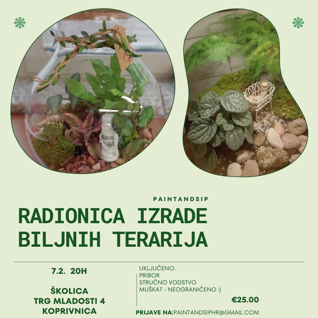 Radionice su otvorene za sve, posebno za one kojima biljke obično ne uspijevaju. Ovi terariji zahtijevaju minimalnu brigu, ali donose maksimalnu svježinu i estetiku! Pridružite se i uživajte u stvaranju vlastite zelene oaze.