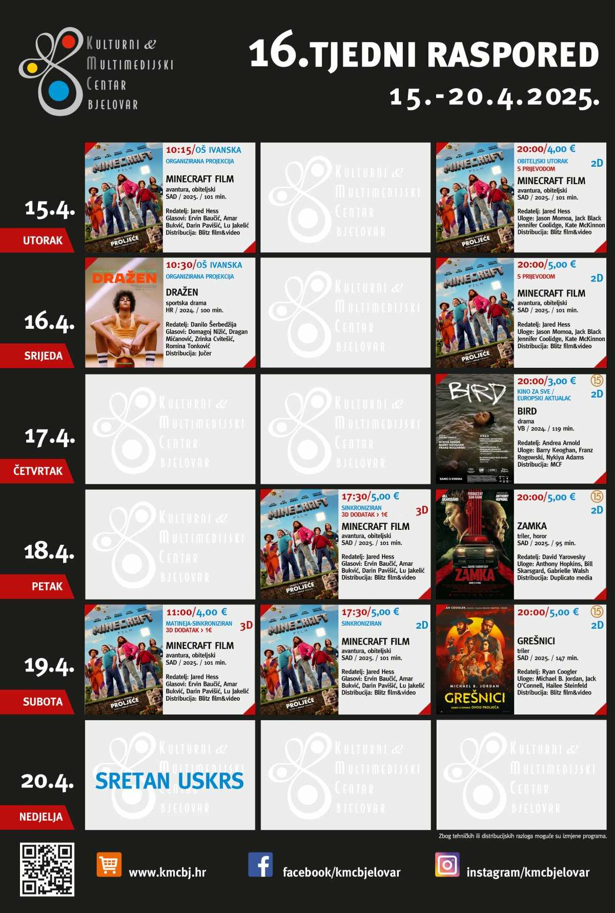 🎬 KINO BJELOVAR – 16. TJEDNI RASPORED (15.–20. 4. 2025.) nalazi se u privitku.