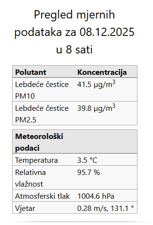 Meteorološki uvjeti i dalje su nepovoljni – visoka vlažnost zraka (95,7 %) i gotovo nezamjetan vjetar (0,28 m/s) otežavaju pročišćavanje atmosfere.