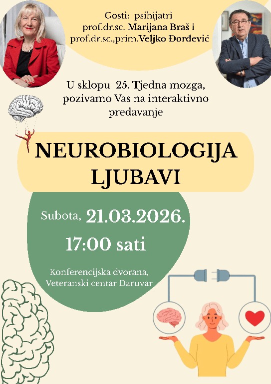 U subotu, 21. ožujka 2026. godine, u konferencijskoj dvorani Veteranskog centra – Podružnica Daruvar, s početkom u 17 sati, održat će se predavanje pod nazivom „Neurobiologija ljubavi“.