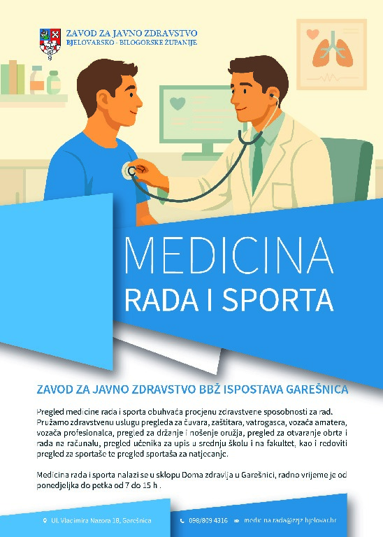 Zavod za javno zdravstvo Bjelovarsko-bilogorske županije obavještava javnost kako je danas, 16. ožujka, započela s radom Služba medicine rada i sporta.
