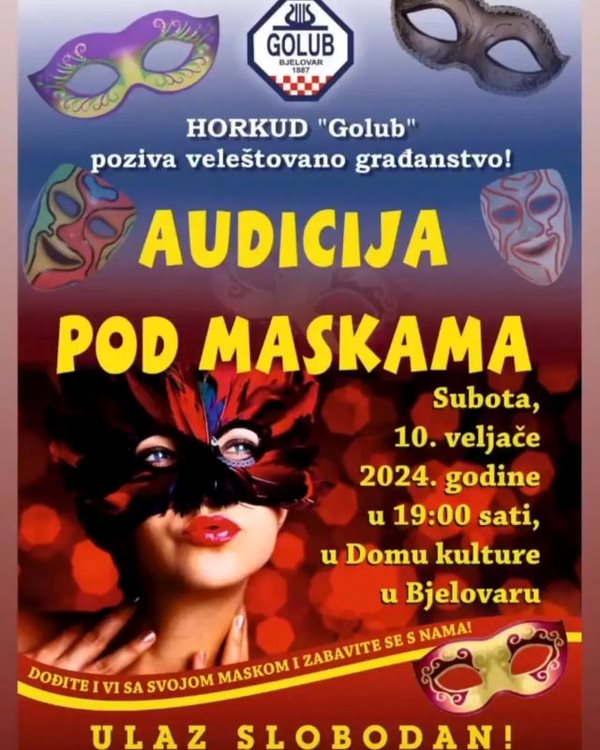 Vrijeme karnevala je krenulo, a vesela ekipa HORKUD-a „Golub“ iz Bjelovara priprema „Audiciju pod maskama“. Pozivaju sve zainteresirane da ih dođu podržati 10. veljače s početkom u 19 sati u Domu kulture te pogledaju kakve su maske i scenske nastupe pripremili. Uz to, publika će imati priliku glasati za najbolju izvedbu.