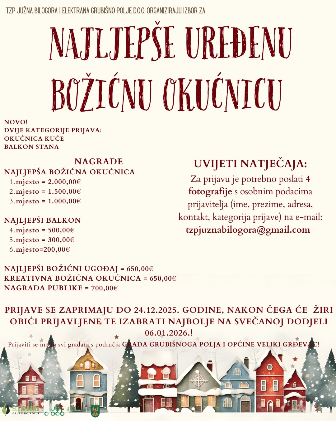TZP Južna Bilogora i Elektrana Grubišno Polje d.o.o. uz potporu grada Grubišnoga Polja, pokreću izbor za Najljepše uređenu božićnu okućnicu 2025. – s rekordnim nagradnim fondom!