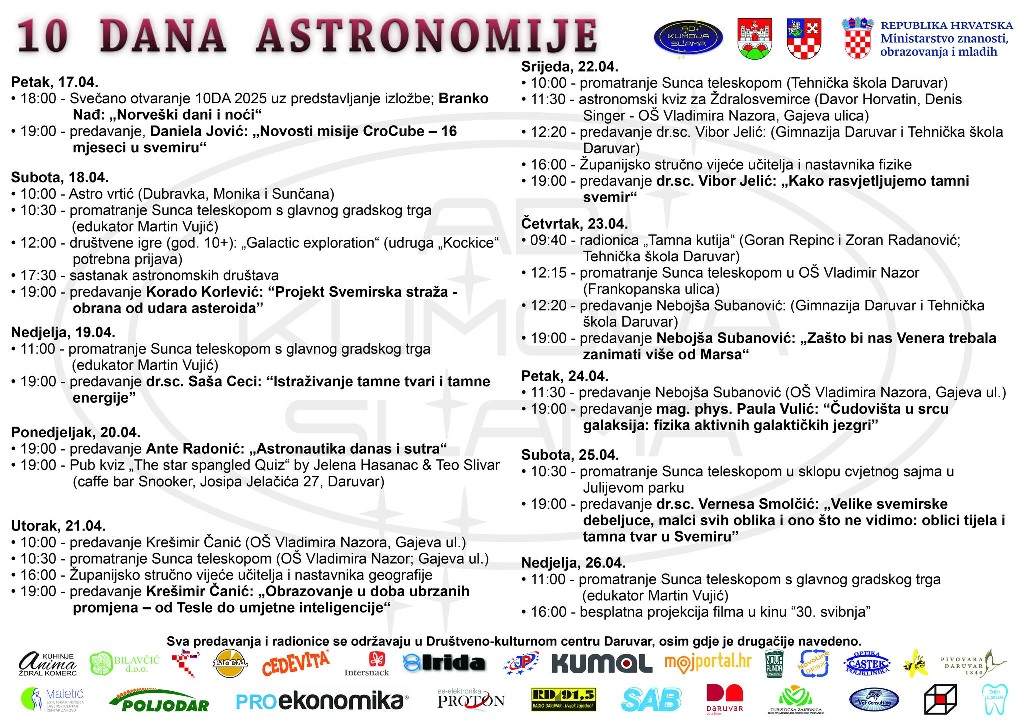 U Daruvaru je započelo 16. izdanje popularne znanstveno-edukativne manifestacije „10 dana astronomije“, koja će trajati do 26. travnja i i ove godine donosi bogat program za sve ljubitelje svemira i znanosti.