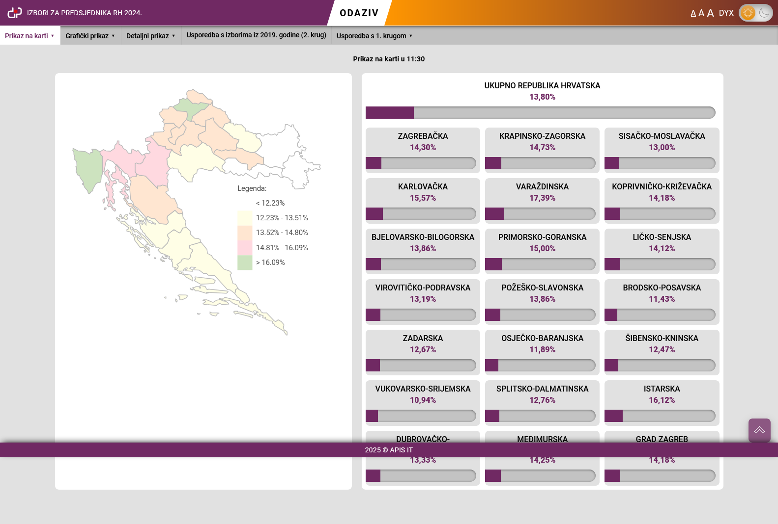 Državno izborno povjerenstvo (DIP) objavilo je prve podatke o izlaznosti na predsjedničkim izborima u drugom krugu. Do 11:30 sati svoje pravo glasa iskoristilo je 460.890 birača, što čini 13,8% ukupnog biračkog tijela.