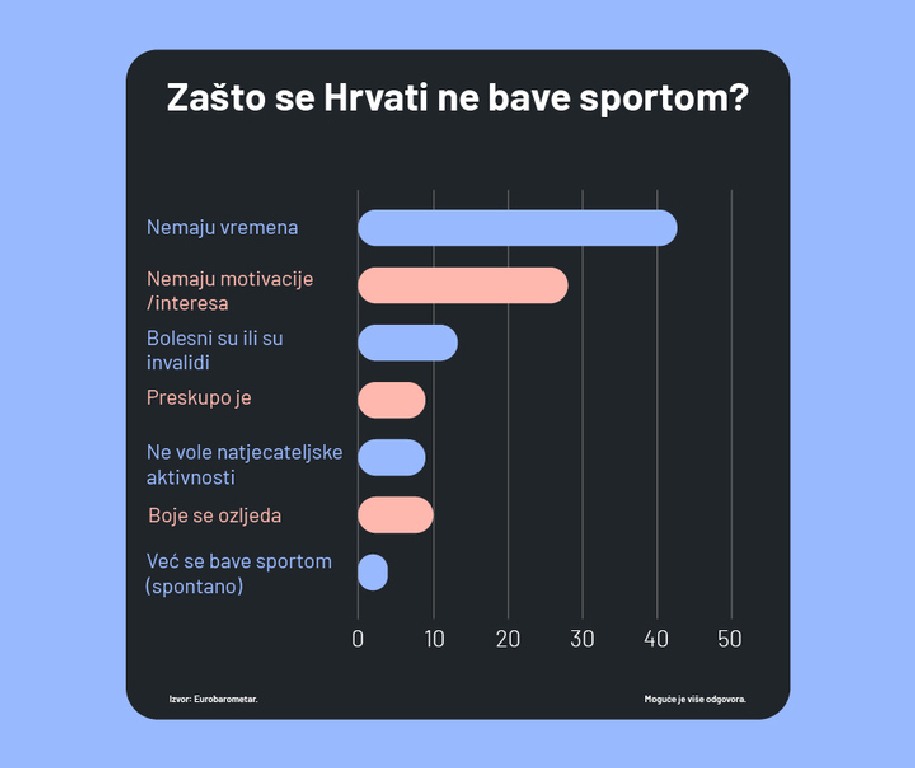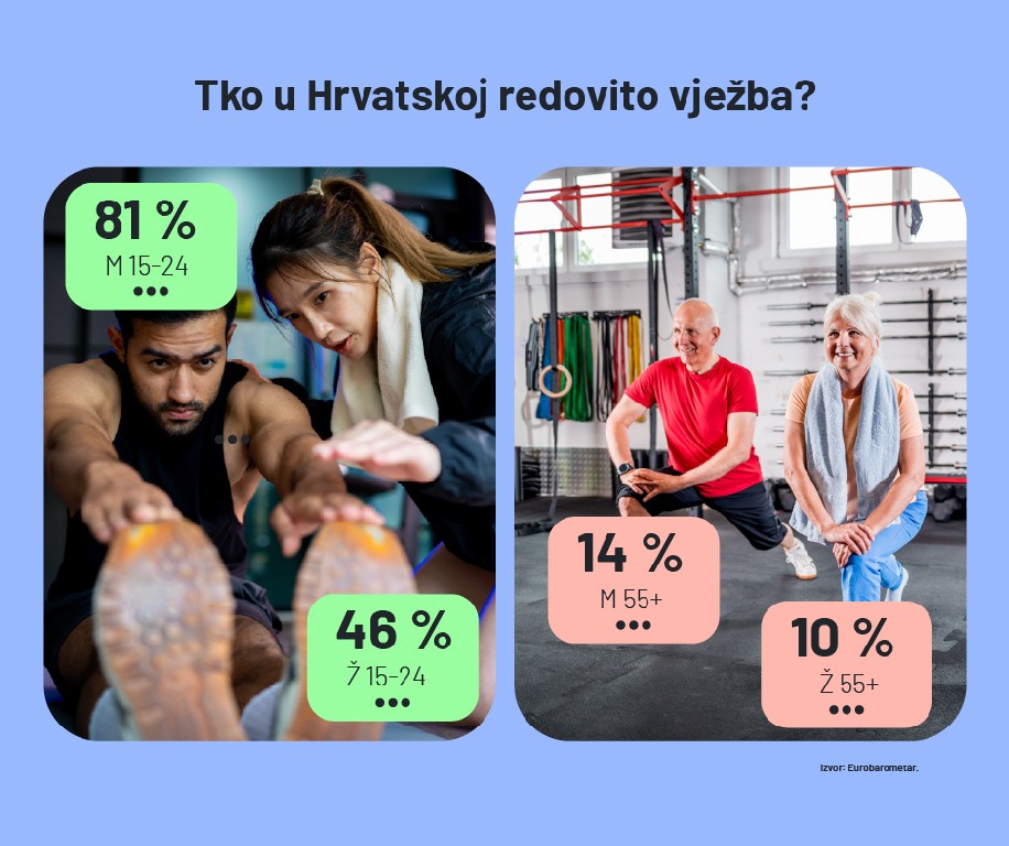 Najveći izazov u Hrvatskoj ostaje kronična neaktivnost starije populacije. Velika većina umirovljenika, čak 90 posto, uopće se ne bavi nikakvom fizičkom aktivnošću. Ne vježba ni 86 posto muškaraca ni 90 posto žena starijih od 55 godina. Upravo te brojke najviše spuštaju hrvatski prosjek, koji je ukupno osam posto lošiji od prosjeka Europske unije. Ipak, mladi muškarci u Hrvatskoj čak su osam posto aktivniji od svojih vršnjaka u ostatku EU-a.